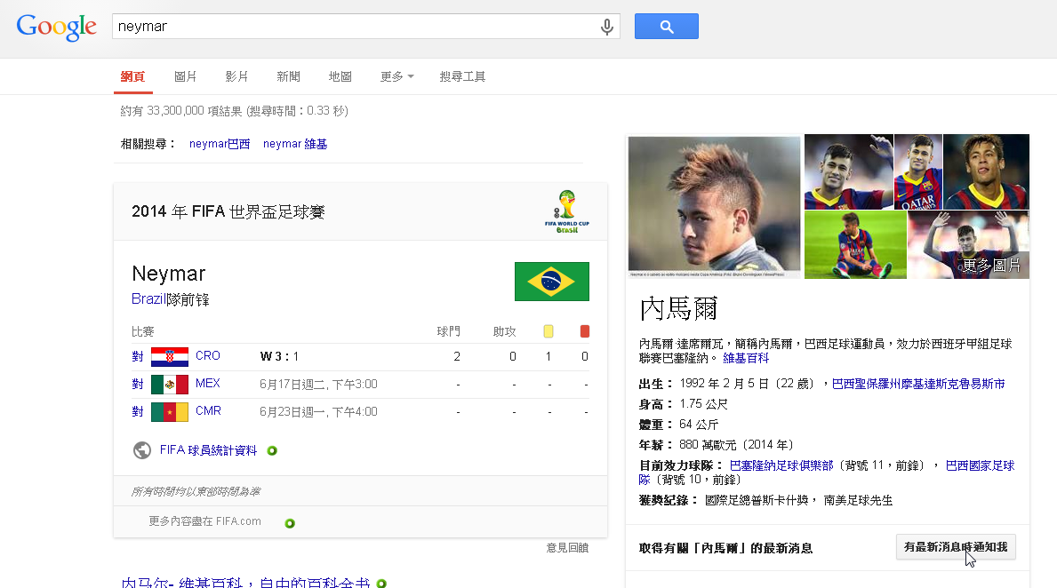 如果你因為這樣的賽事而對某個球星感到興趣,點擊球星圖像進入 Google 搜尋頁面,這時候可以看到這位球員完整的資料介紹與最新數據統計。